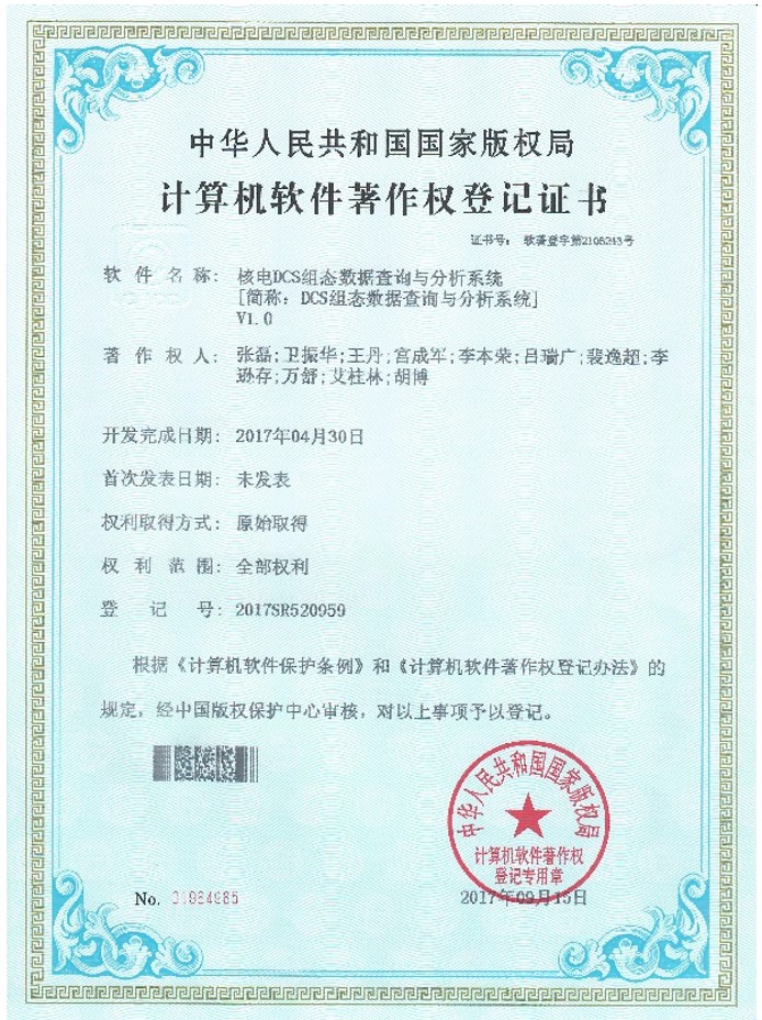 核电站仪控管理系统,DCS分析诊断系统,DCS组态优化系统,KIC报警 规程分析系统等专用系统软件著作权,